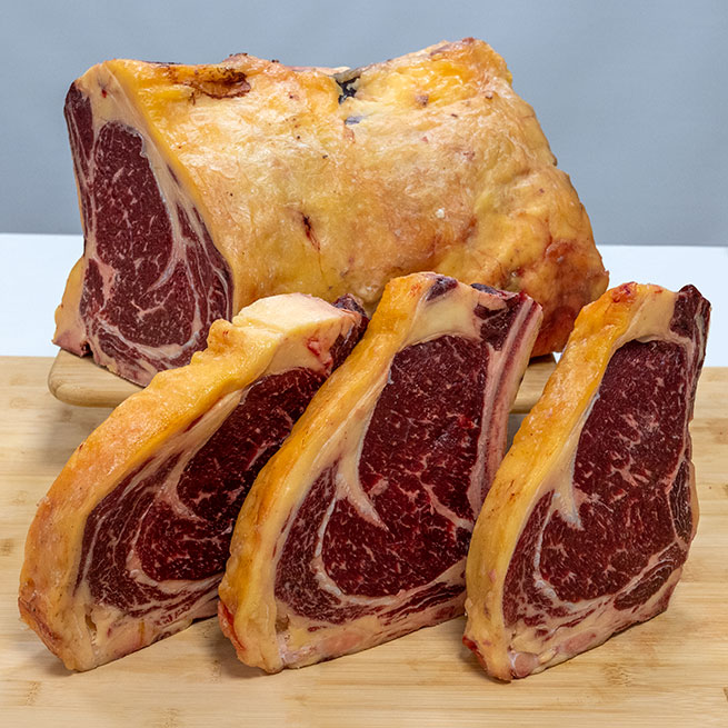 Edición Oro: Vaca madurada, con un marmoleado perfecto, grasa de cobertura amarilla y un buen veteado todo con su maduración optima para su consumo.