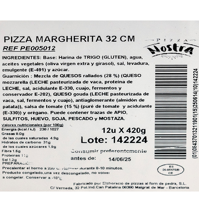 Formato: Pizza 445Gr, 32Cm diametro. Caja 6Uds