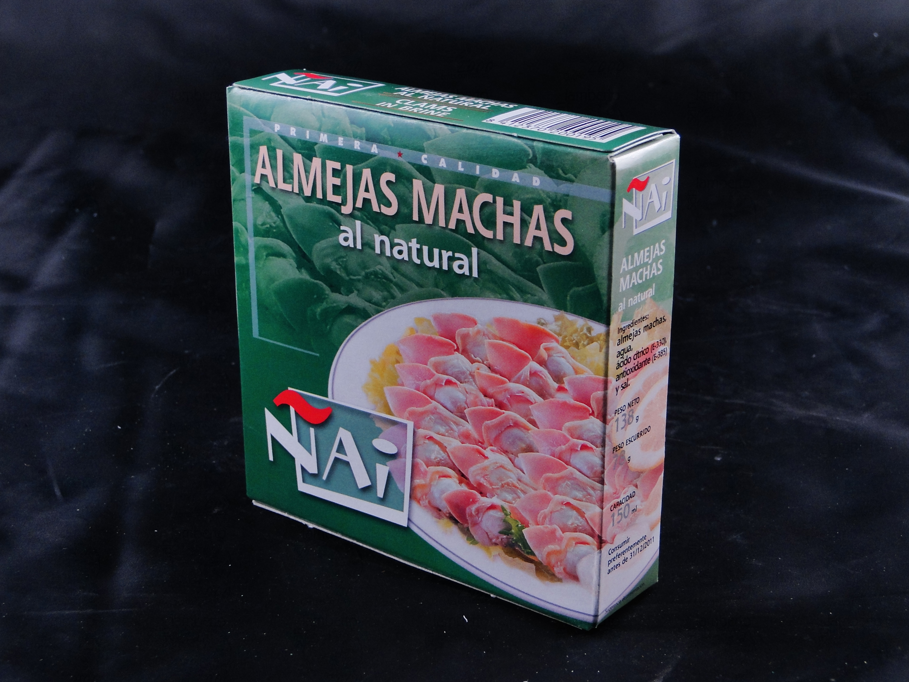 Lata de almejas machas de la casa Ñai de 150Gr. Marisco envasado en conserva para garantizar su máxima frescura y conservar su sabor.