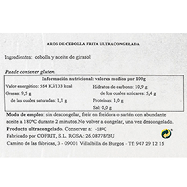 Descripción: Aros de cebolla frita, ideales como aperitivo o para celebraciones. Congelado.