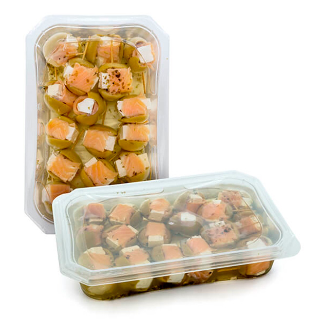Descripción: Banderilla bomba fresca verde. Contiene aceituna gordal reina, qeuso feta, salmón ahumando y orégano. Vida útil 35 días.