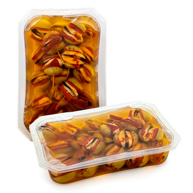 Descripción: Banderilla bomba mejillón. Contiene aceituna gordal reina, mejillón macerado y pimiento de piquillo. Vida útil 35 días.