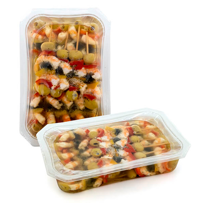 Descripción: Banderilla cuhete doble langostino. Contiene pimiento rojo, langostino, aceituna verde rellena de pimiento rojo y aceituna negra deshuesada . Vida útil 35 días.