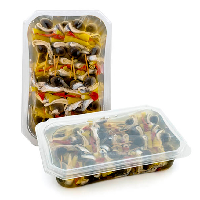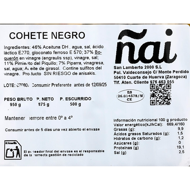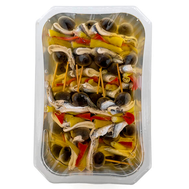 Descripción: Banderilla cohete negro. boquerón Contiene pimiento rojo, piparra, boquerón y aceituna negra deshuesada . Vida útil 35 días.