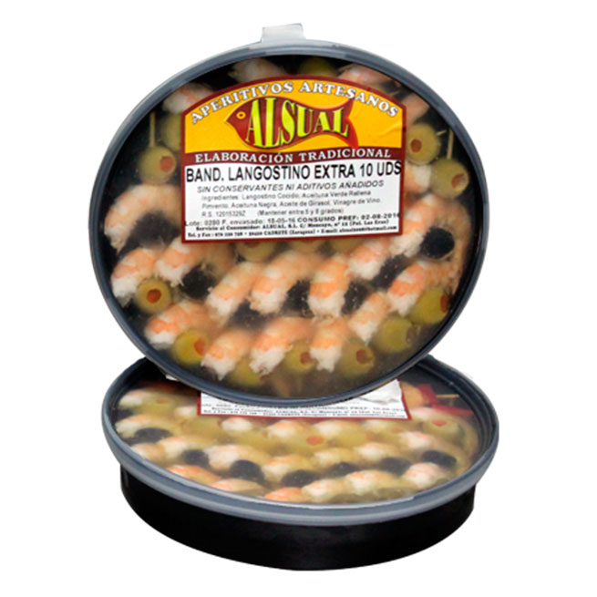 Descripción: Banderilla de langostino a base de aceituna verde, langostino, aceituna negra, langostino, aceituna verde, aceite de girasol, aceite de oliva y vinagre de vino.