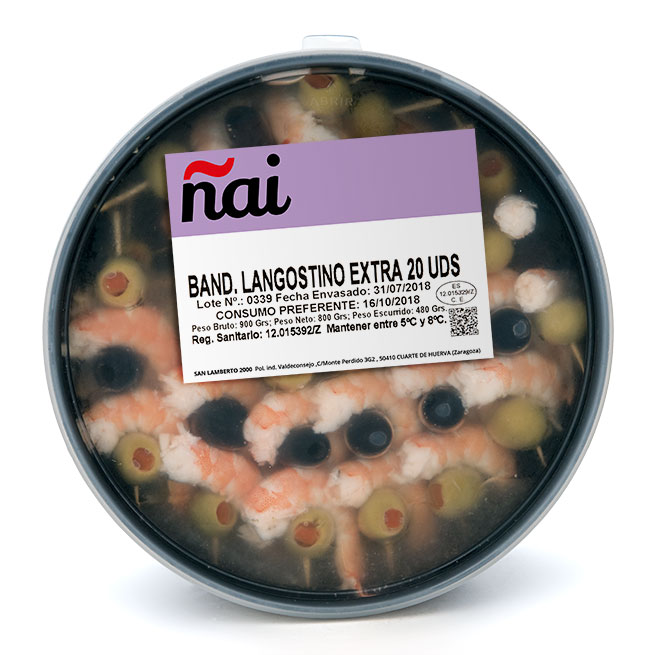 Descripción: Banderilla de langostino a base de aceituna verde, langostino, aceituna negra, langostino, aceituna verde, aceite de girasol, aceite de oliva y vinagre de vino. Cada banderilla contiene 2 langostinos