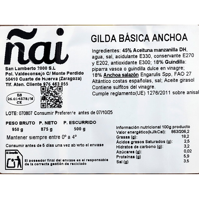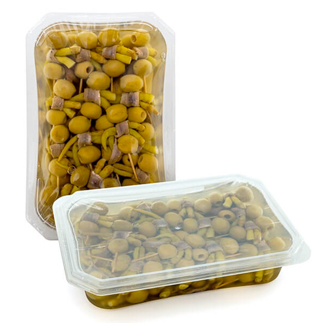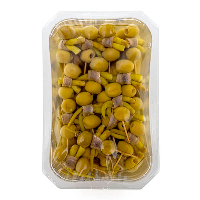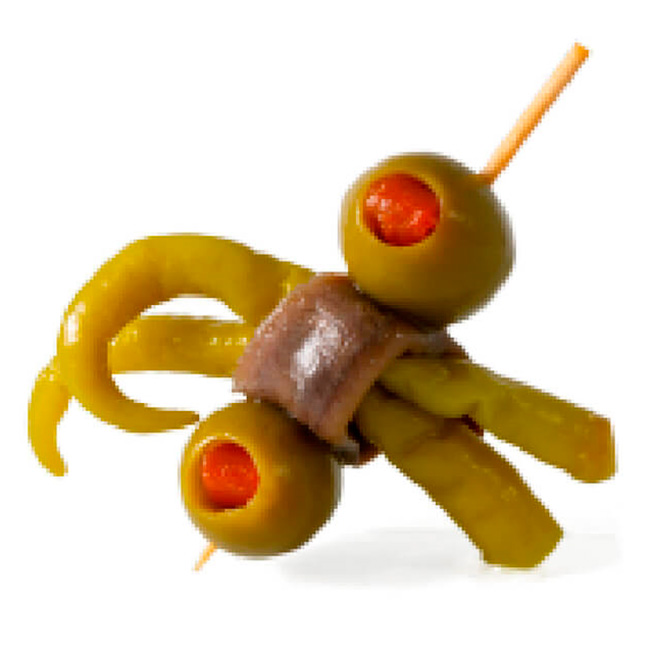 Descripción: Banderilla gilda básica anchoa. Contiene aceituna verde, guindilla y anchoa. Vida útil 60días.