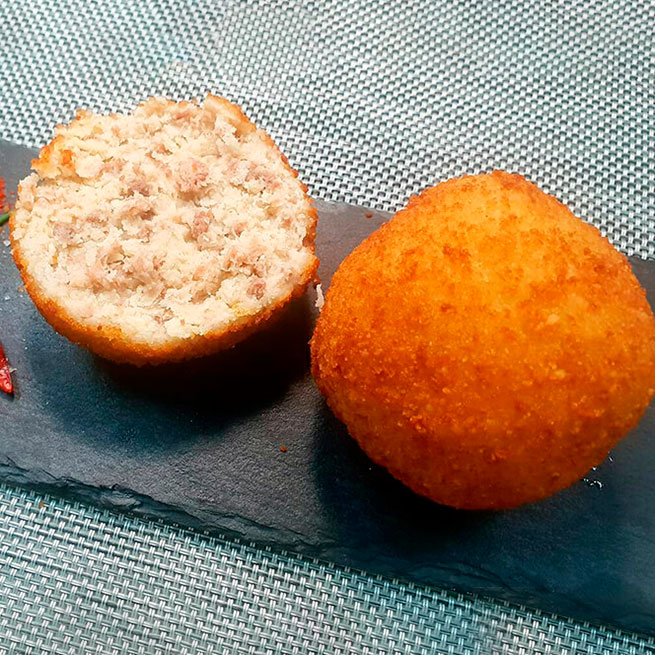 Descripción: Bola cremosa de copo de patata mezclada con un sofrito de cebolla, carne de ternera nacional, rebozada en un crujiente pan rallado y con un toque picante de cayena. Ideal para tapas.