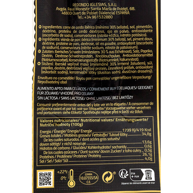 Descripción: Chorizo bellota, mitades. Elaborado a partir de la mejor selección de carne ibérica y adobado con pimentón de la Vera D.O.P y especias de primera calidad.