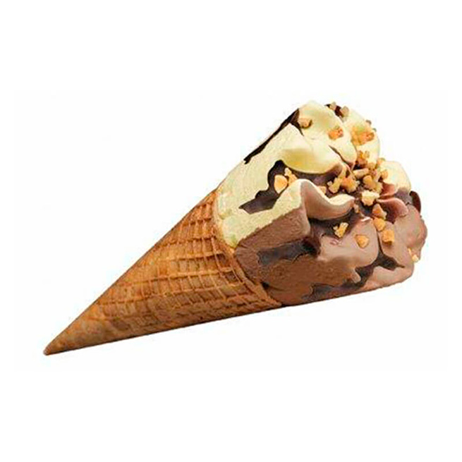 Descripción: Cono helado vainilla y chocolate, decorado con cobertura de chocolate y crocanti de almendra.