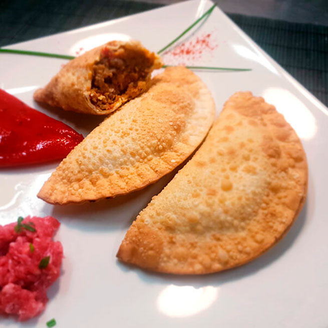 Descripción: Empanadilla artesana carne picante efecto Gourmet. Relleno elaborado a base de carne de ternera nacional, cerdo, cebolla y pimiento del piquillo con una reducción de vino blanco. Ideal para tapas o plato.