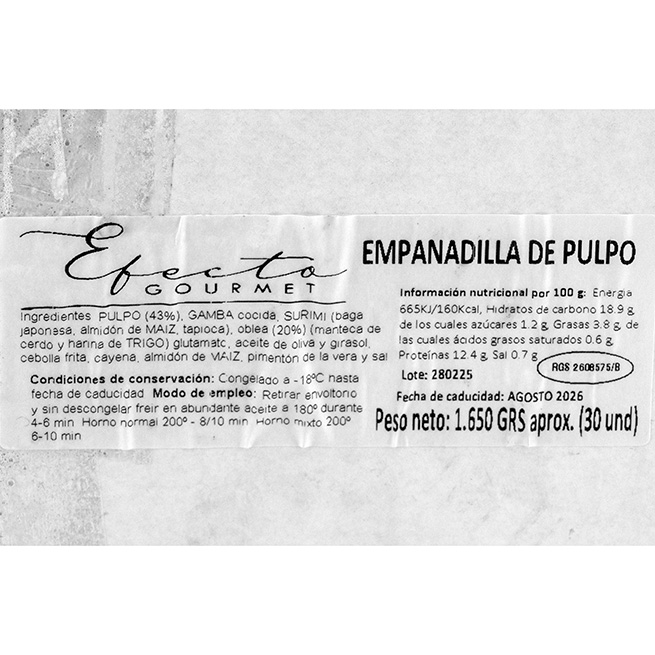 Descripción: Empanadilla artesana pulpo Gourmet. Relleno elaborado a base de pulpo troceado. Ideal para tapas o plato.