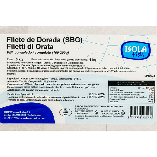 Descripción: Filete de dorada con piel, sin cabeza, ni espinas. Ideal para raciones.