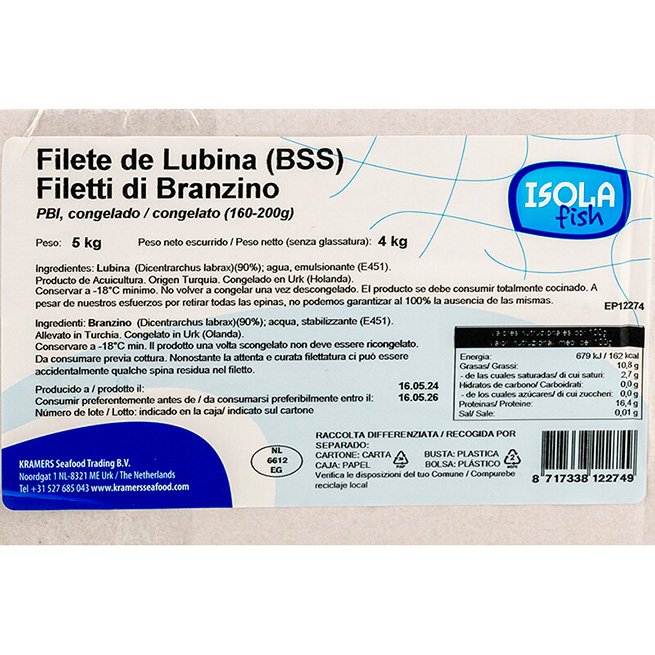 Filete de lubina limpia sin cabeza ni espina. Ideal para raciones.