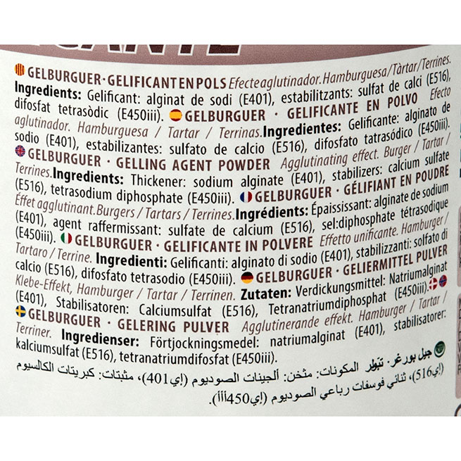 El Gelburguer es una mezcla de un alga parda (alginato) más un sulfato de calcio, que permite elaborar geles totalmente irreversibles térmicamente ideal para estructurar o atar terrinas de carnes y pescados si tienen un poco de agua libre y cualquier alimento (carnes, pescados, etc..., así como picados, trozos, etc...). El gramaje a utilizar será de 10 a 15 g por kg de producto a tratar, al que se añadirán unos 100 g de líquido. Pasados 60 minutos se habrá gelificado.