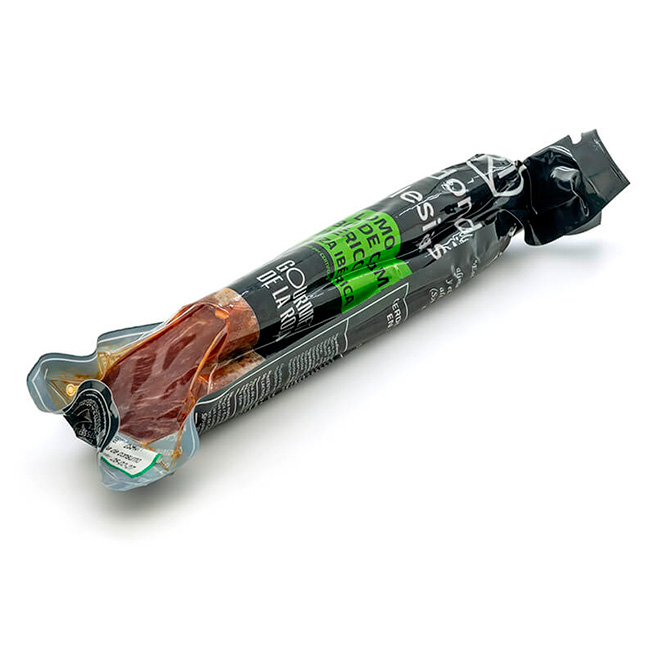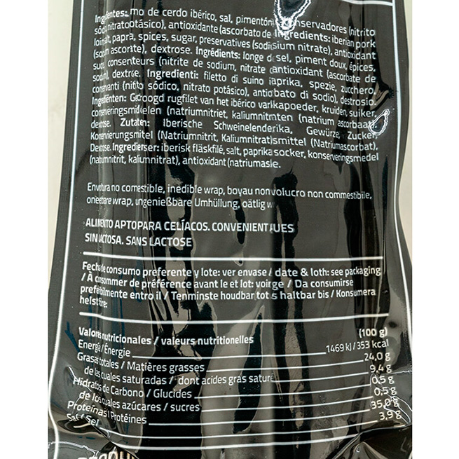 Descripción: Lomo cebo de campo 50% raza ibérica, mitades. Elaborado a partir de uan de las piezas más nobles del cerdo ibérico, el lmo., y adobado con pimentón de la vera D.O.P. y especias de primera calidad.