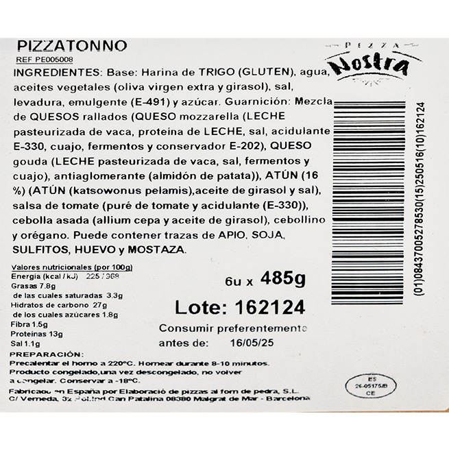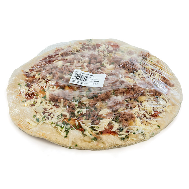 Descripción: Pizza Atún, congelada. Nuestras pizzas siempre quedan crujientes, con una textura alveolada e irresistible. Ofreciendo una apariencia totalmente artesana.