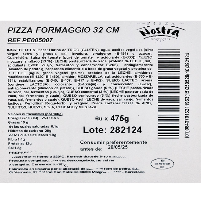 Formato: Pizza 490Gr, 32Cm diametro. Caja 6Uds