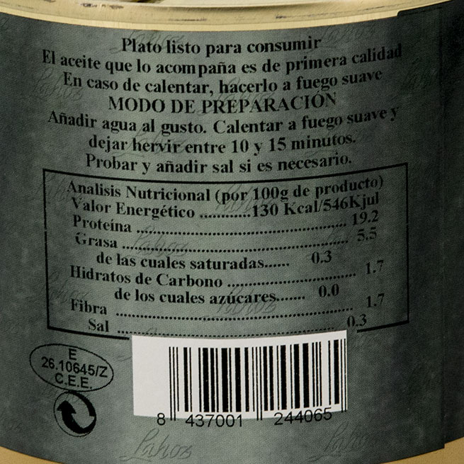 Alubias pochas con perdir de 550Gr de la casa Lahoz. .. Ración: Para dos personas. .. Modo de empleo: Verter todo el contenid en un recipiente, añadir agua y sal y dejar hervir durante unos doce minutos. .. Las pochas adquieren un color más oscuro de lo habitual porque no llevan ningún tipo de colorante ni aditivo