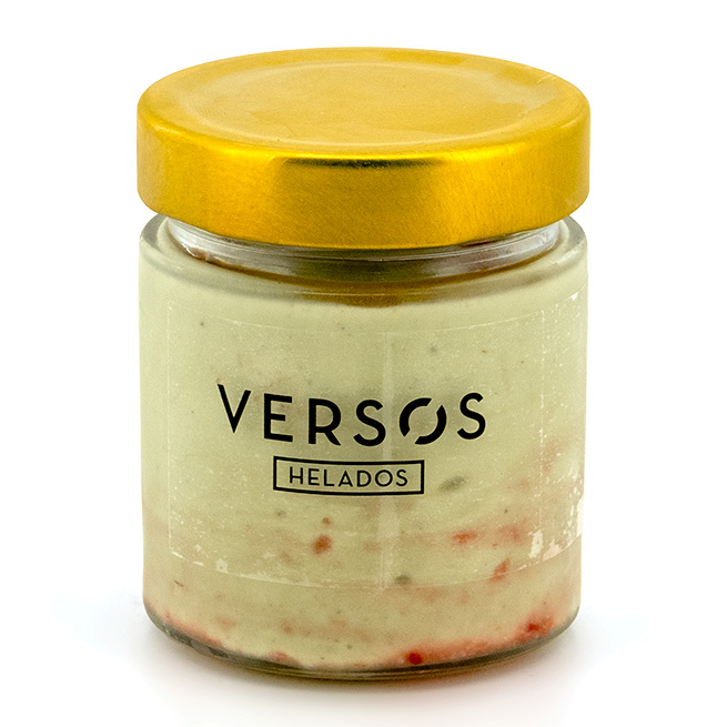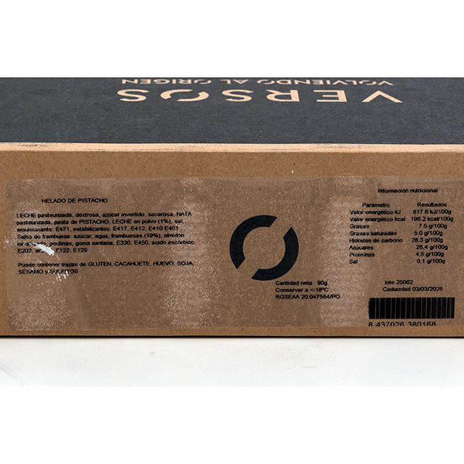 Descripción: Postre individual verso frío de Pistacho y Frambuesa.