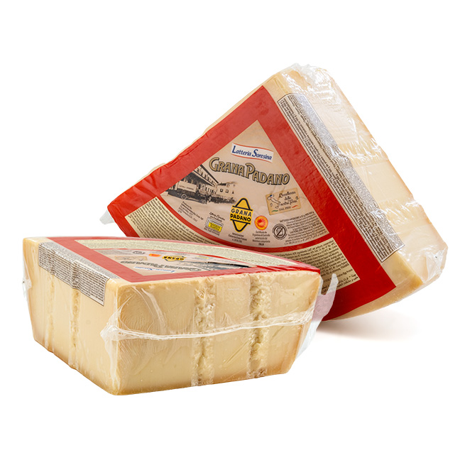 Descripción: El queso grana padano tiene su origen en Italia, es un queso de pasta cocida compacta y dura. El tamaño del queso es enorme, ruedas de unos 24Kg a 40Kg.