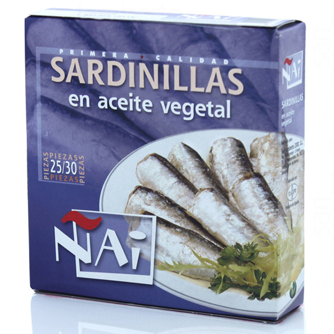 Lata de sardinilla en aceite de la marca Ñai. Esta lata contiene de 25 a 30 piezas de sardinillas en aceite. Lata ideal para 4 raciones, acompañe cualquier ensalada o bocadillo con estas sardinillas en aceite Ñai.